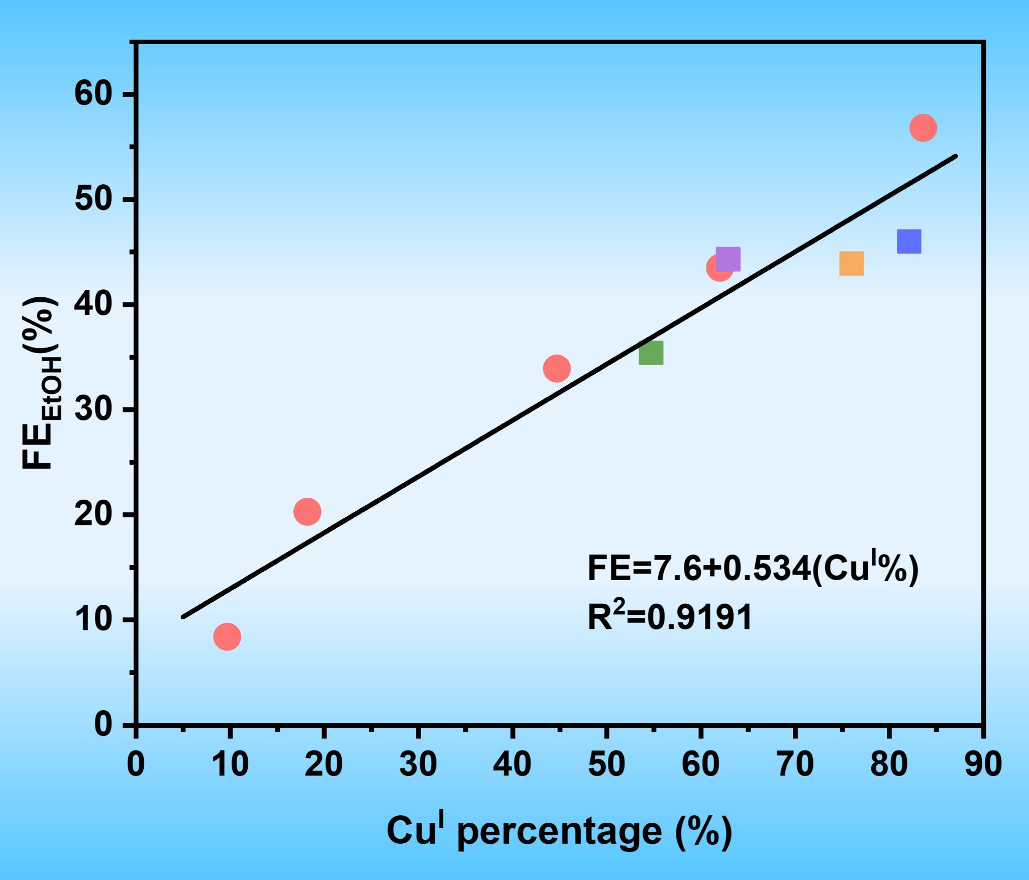 本研究合成的高CuⅠ含量的Cu基催化剂在膜电极电解池中电催化CO2还原合成C2+产物的法拉第效率(FE)达到87.3%,分电流密度为676.0 mA cm-2,其中乙醇的FE为56.8%,分电流密度高达439.8 mA cm-2,并且该催化体系在工业电流密度下110 h的连续电解过程中保持稳定。同时,该研究发现了CuⅠ的原子百分比与乙醇选择性之间的线性关系,明确了CuⅠ的关键催化作用。该工作为设计高效、稳定的CO2电还原制多碳醇的Cu基催化剂提出了新的思路。